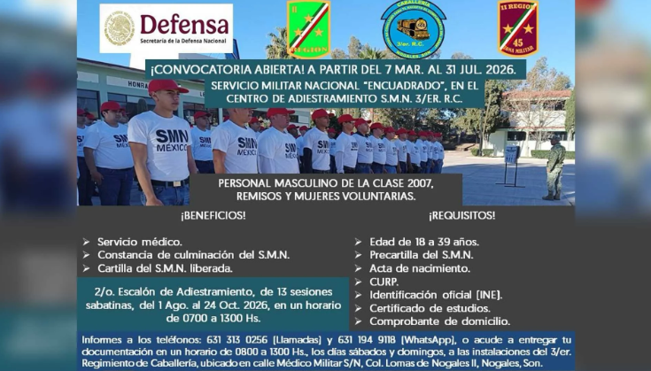 La Secretaría de la Defensa Nacional (SEDENA), a través de la Comandancia de la II Región Militar y la 45 Zona Militar, emitió la convocatoria para jóvenes interesados en cumplir con su Servicio Militar Nacional (SMN) bajo la modalidad de “Encuadrado” para el año 2026. Crédito: Nuevo Día